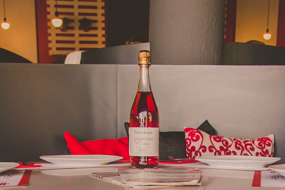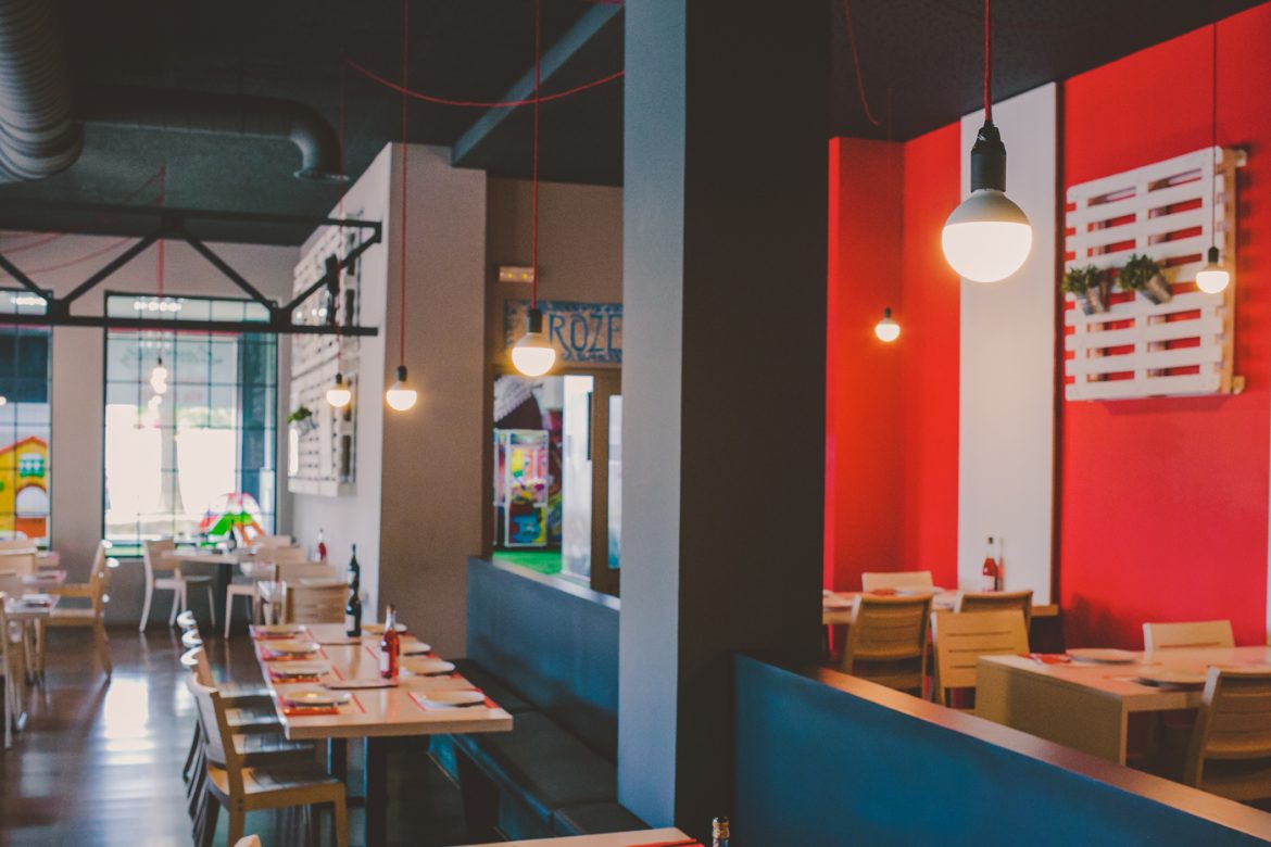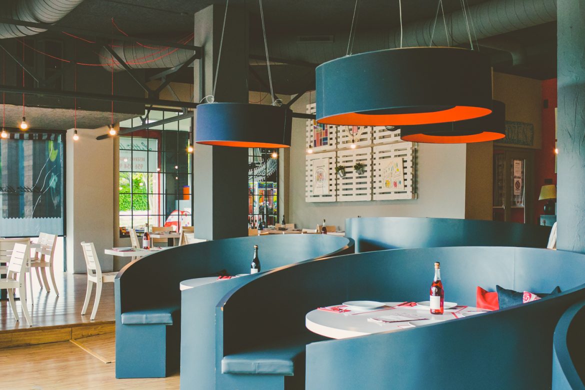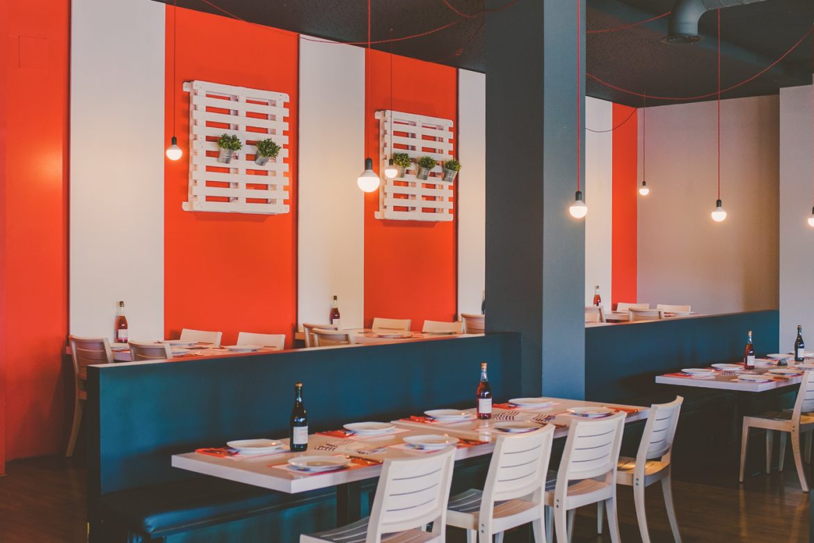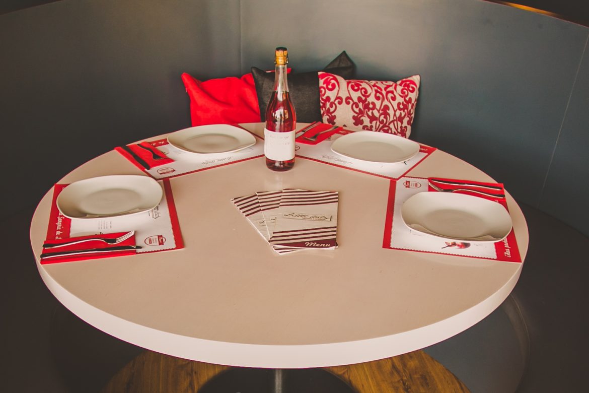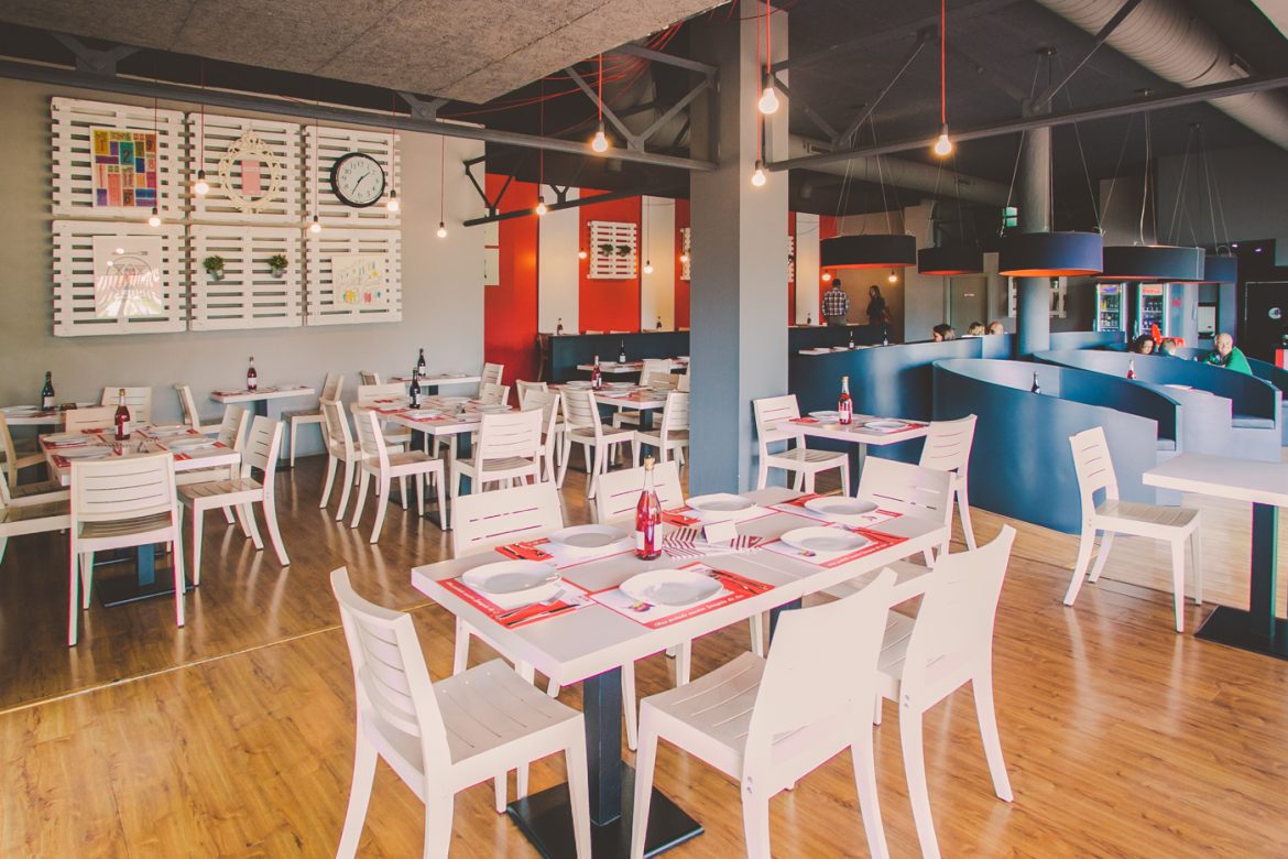 Salón a dos alturas con diferente tipo de mobiliario: mesas y sillas tradicionales y también mesas redondas con sofá para más intimidad. Todo ello en blanco, gris, negro y un toque de rojo creando un espacio único y atemporal.
